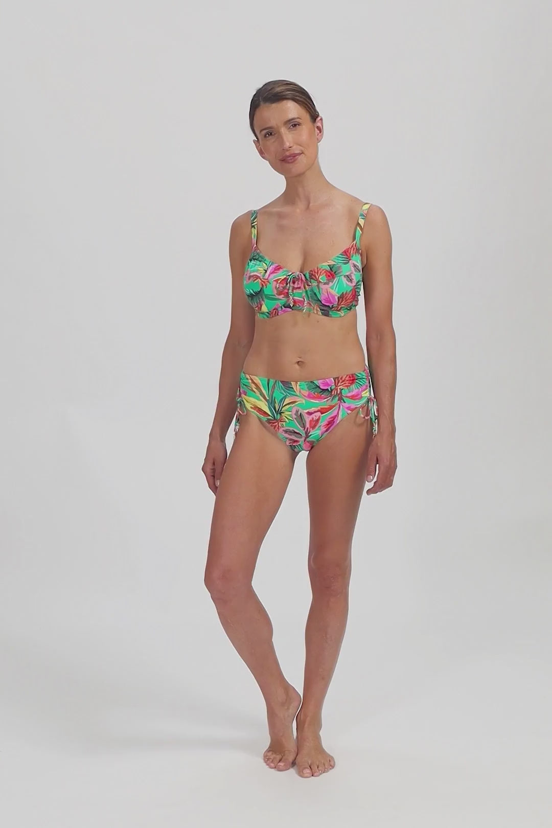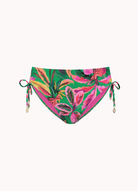 Dieses Modell ist 1,75m groß und trägt Größe 38. Dieses Bikini Hose hat einen bedeckten Passform, sowohl auf der Vorder- als auch auf der Rückseite. Es fällt hoch auf die Hüften. Wenn Sie etwas mehr Beinausschnitt wünschen, können Sie den Kordelzug verwenden, um die Seiten etwas kürzer zu machen.