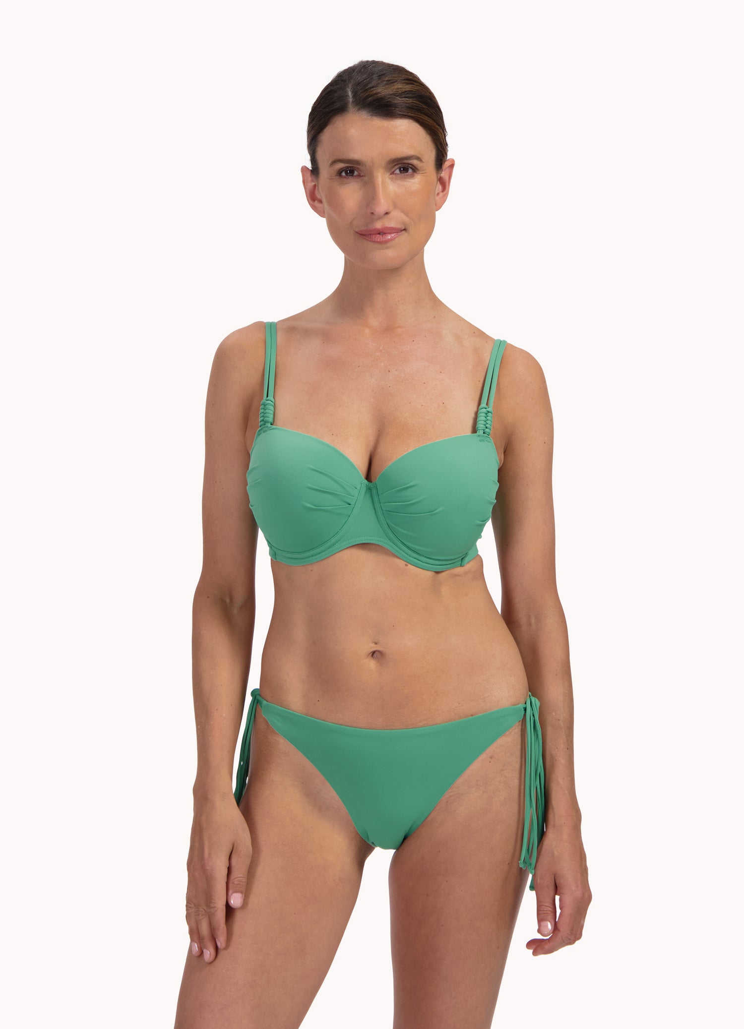 Das Model ist 1,75 m groß und trägt Größe 38E. Geeignet für große Körbchengrößen D, E und F, ist es ein Vorgeformte Top, das Ihren Brüsten eine runde Form verleiht und Ihr Dekolleté elegant betont. Es bietet viel Unterstützung für große Brüste. Für zusätzlichen Komfort können Sie die Schulterträger im Rücken gekreuzt tragen.