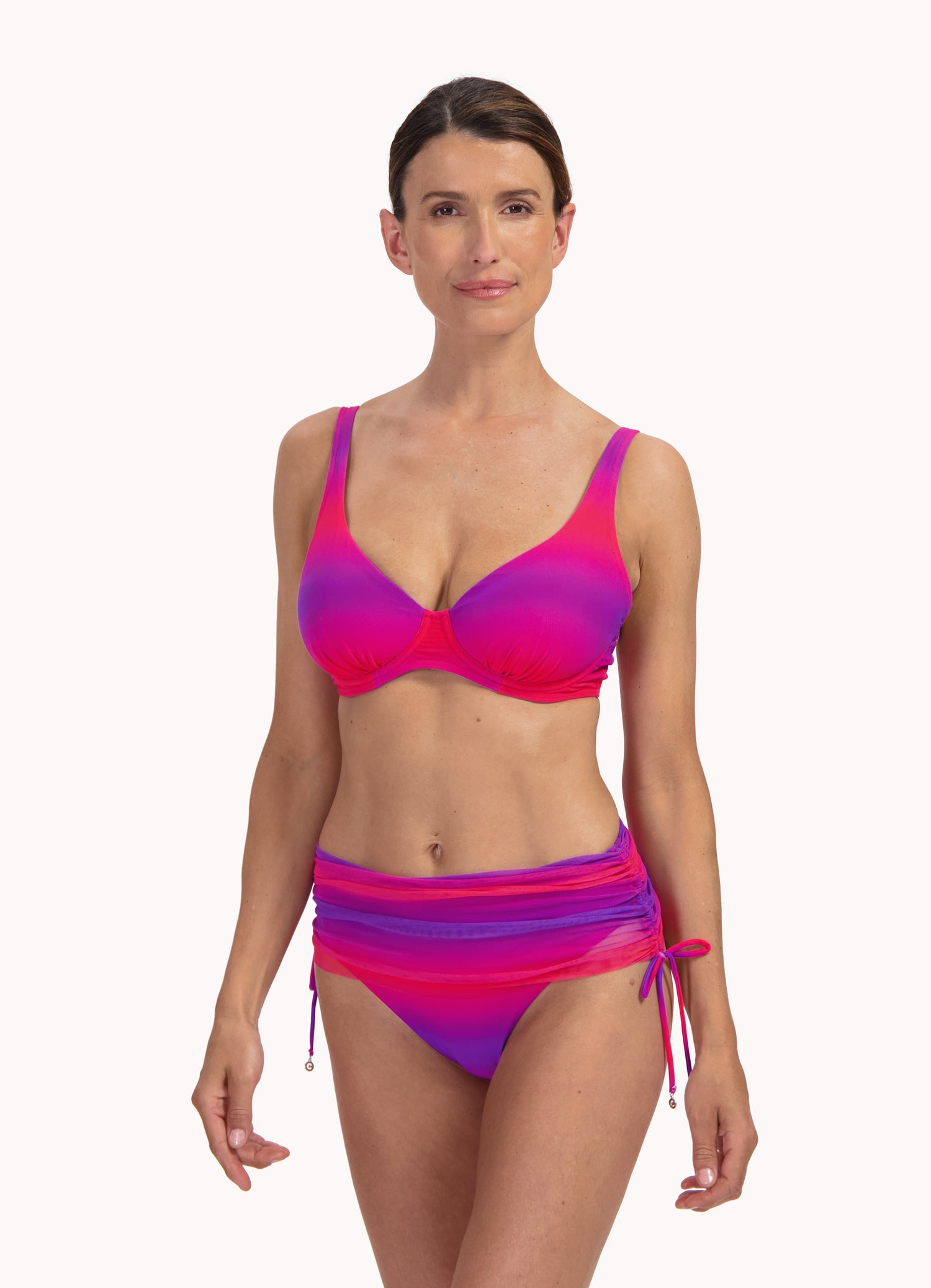 Das Model ist 1,75 m groß und trägt Größe 38E. Elegante Form mit guter support bis Cup größe. F. Dieses Oberteil ist ideal, wenn Sie schmale Schultern haben, denn die breiteren Träger lassen Ihre Schultern im Einklang mit dem Rest Ihrer Figur erscheinen.