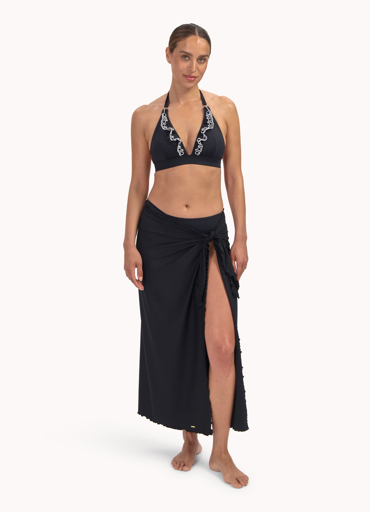 Model is 1.78 m and is wearing size 38B. This top is nice if you have slightly wider shoulders due to the halter shape and deep V-neck. This makes you optically narrower. This bikini top is featured in cup B and cup D offered. Do you have cup A? Then choose B in a smaller size than you would normally choose. Do you have cup C? Then choose cup D in a smaller size than you would normally choose. If you prefer to choose a cup size smaller, choose another size larger.