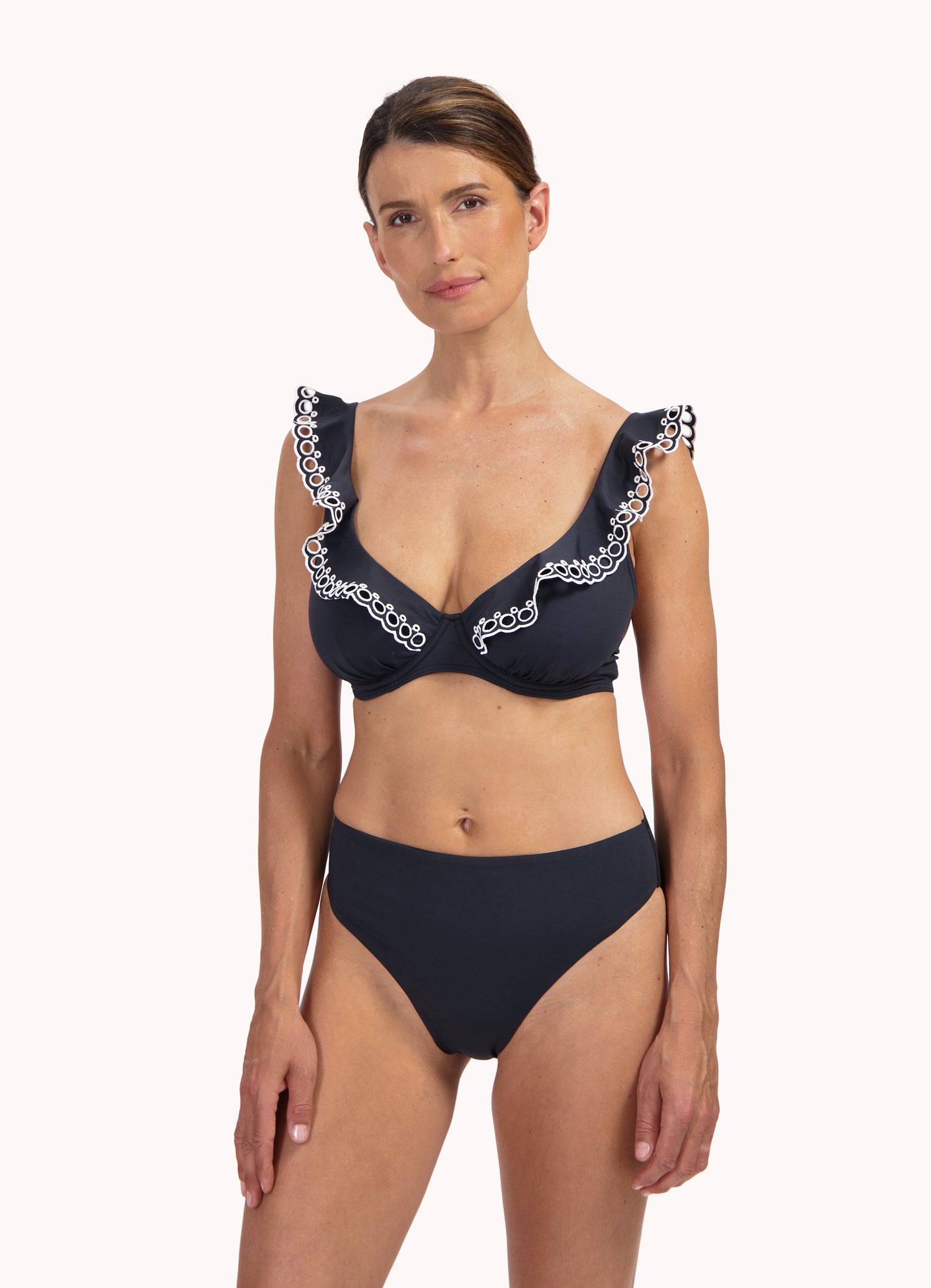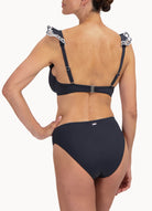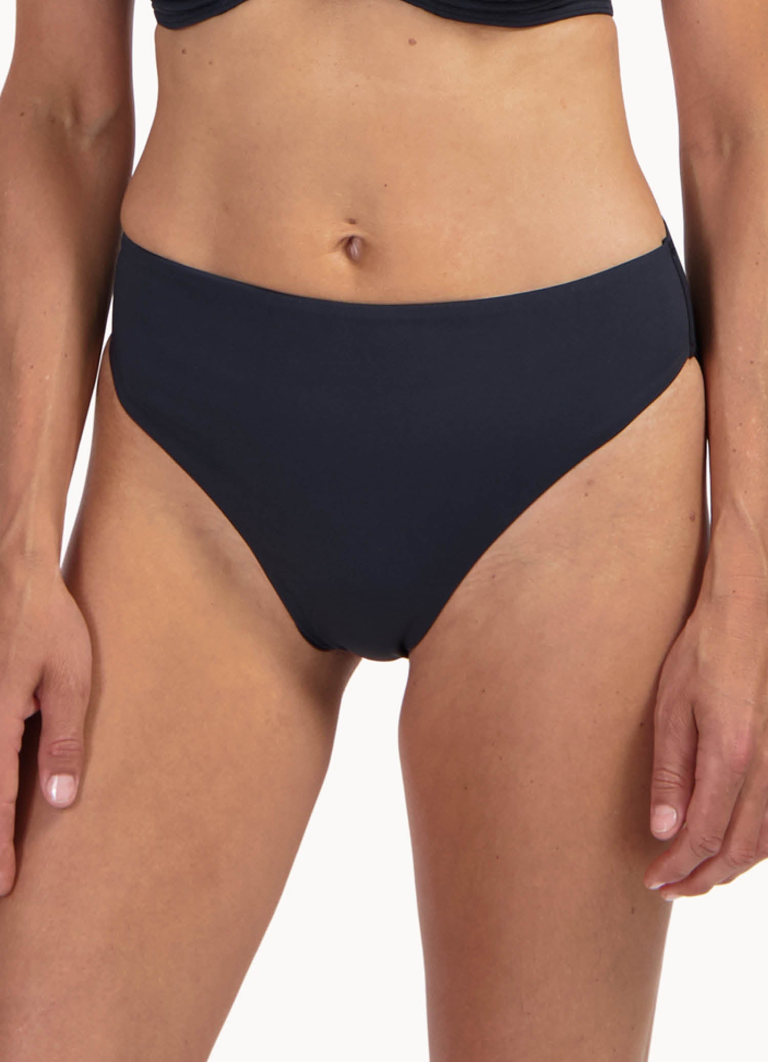 This model is 1.75m and wears size 38. This bikini bottom falls high on your waist and has a high leg opening, which provides optical leg extension. It is slightly narrower on the buttocks for an elegant, sexy look.