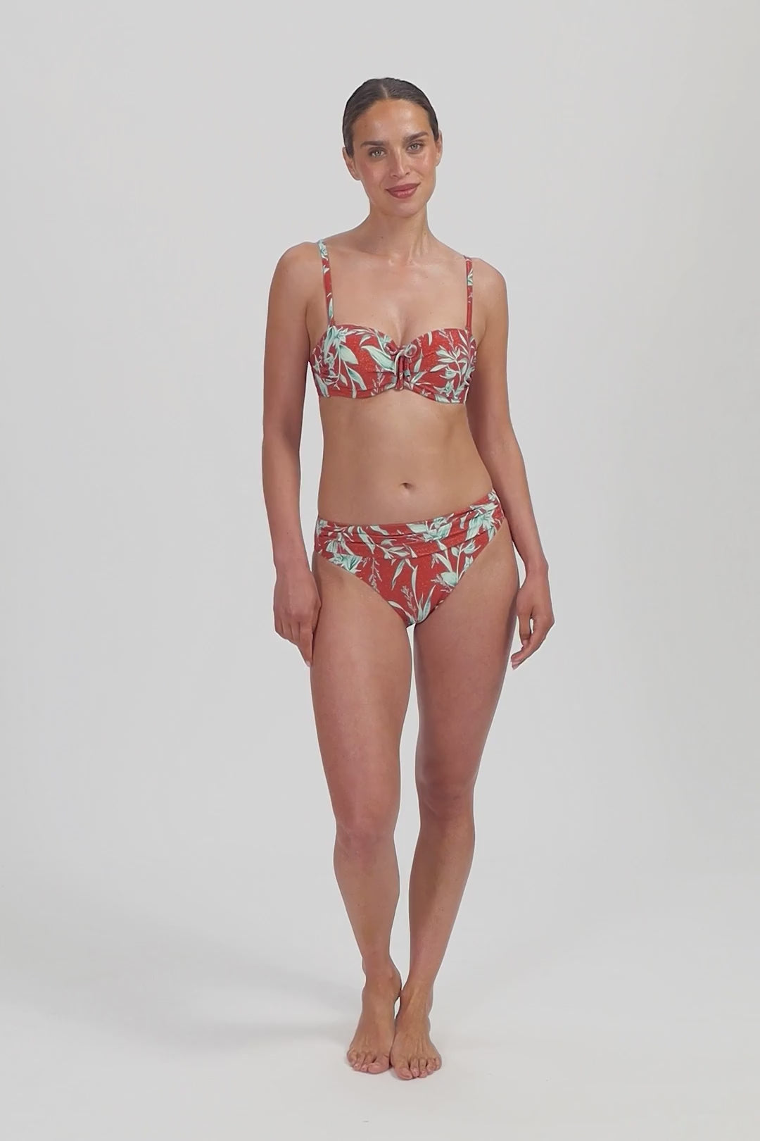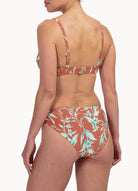 This model is 1.78m and wears size 38. This bikini bottom falls just above your hips (medium waist) and has medium coverage on your buttocks. Ideal if you want to conceal a small tummy, thanks to the flattering pleats.
