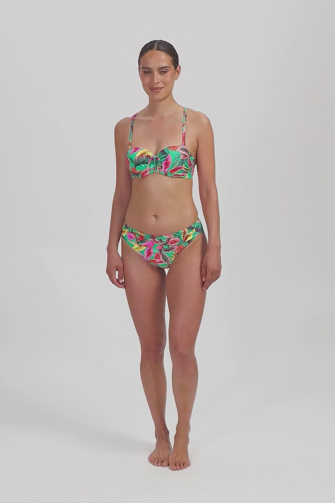 Model is 1,78 m en draagt maat 38B. Deze bikinitop biedt een subtiele lift, een mooi decolleté en laat je schouders prachtig uitkomen. Draagbaar als strapless, halter of met rechte schouderbandjes, zodat je zelf kiest wat jouw figuur het meest flatteert. De bikinitop heeft een goede ondersteuning door de beugel en voorgevormde cups. Zelfs strapless zit deze top nog stevig! Vanaf cup D heeft deze top bredere bandjes voor extra ondersteuning.