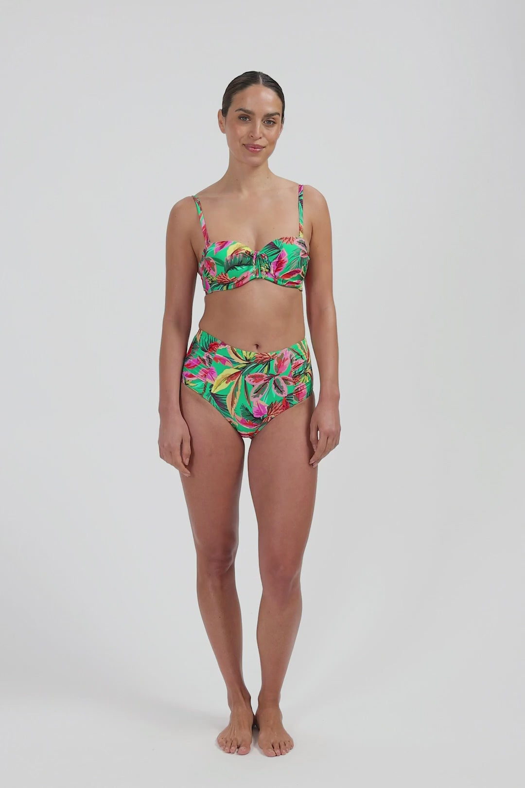 Dit model is 1,78m en draagt maat 38. Dit bikinibroekje valt hoog in de taille en heeft een volledige bedekking op de billen. Doordat het bikinibroekje gevoerd is met power mesh aan de voorkant heeft het een licht corrigerend effect bij de buik. Ideaal als je een buikje wilt verdoezelen. Ook geschikt in combinatie met een tankini top.