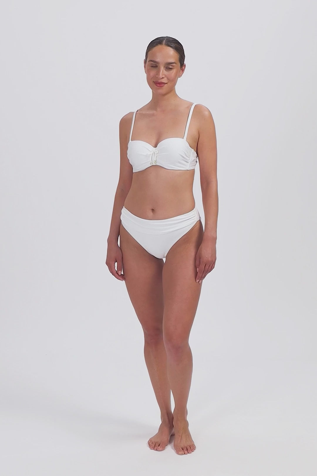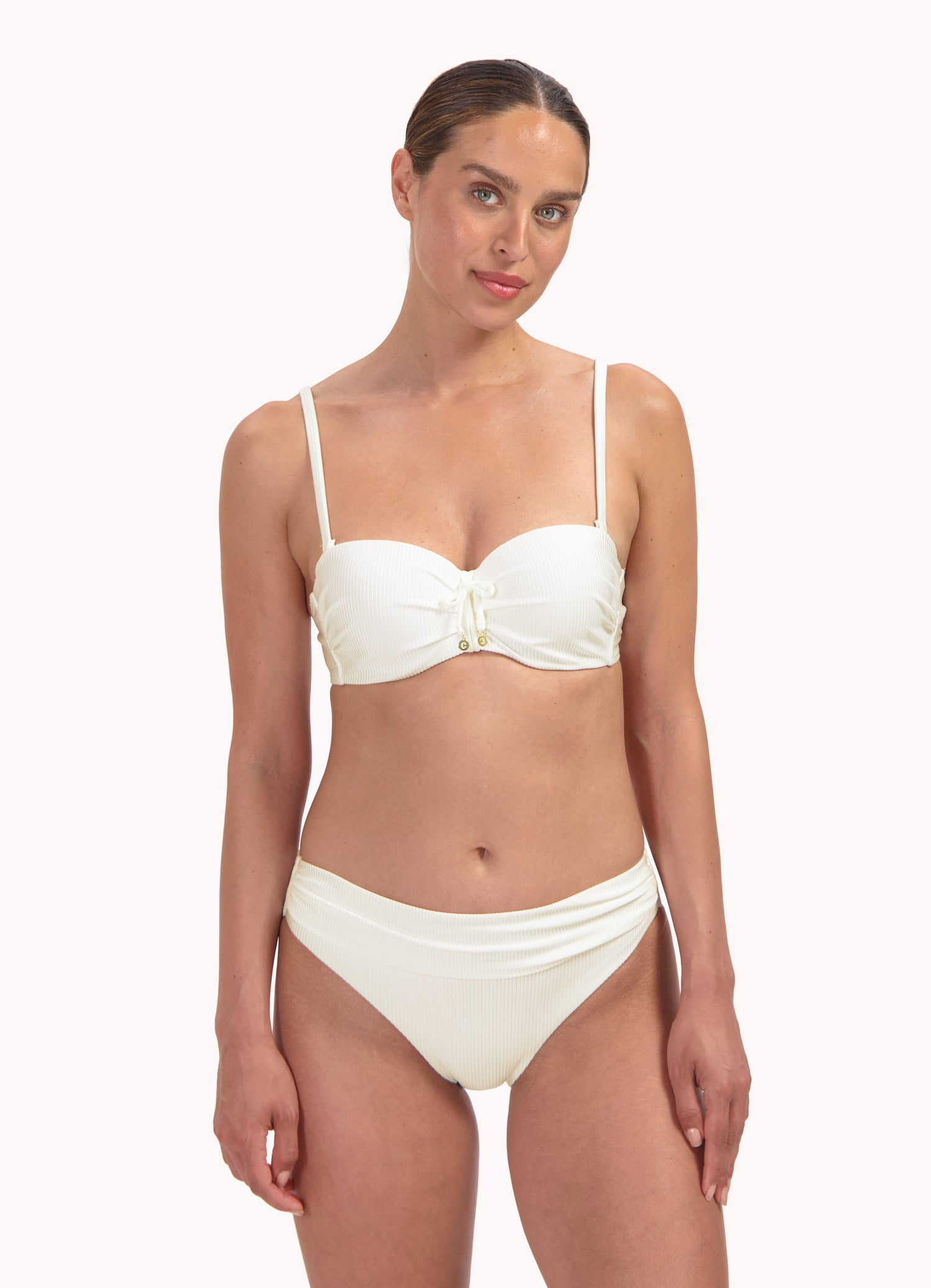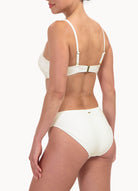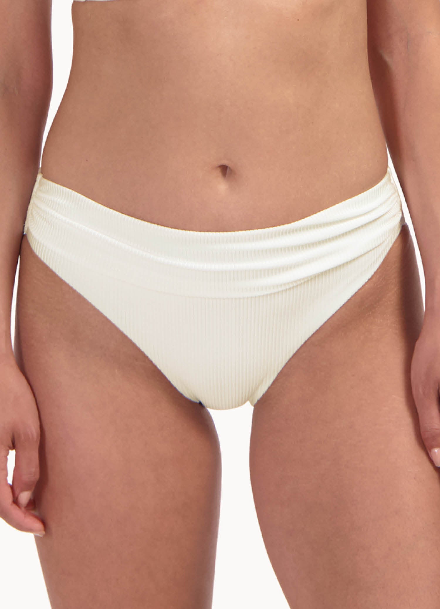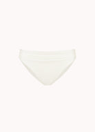 Dit model is 1,78m en draagt maat 38. Dit bikinibroekje valt net boven jouw heupen (middelhoge taille) en heeft een medium bedekking op jouw billen. Ideaal als je een klein buikje wil verdoezelen, door de flatterende plooitjes.