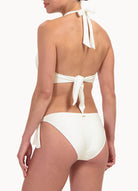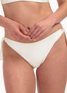 Dit model is 1,78m en draagt maat 38. Dit bikinibroekje met strikbandjes valt laag op jouw heupen en heeft een smalle bedekking op jouw billen.