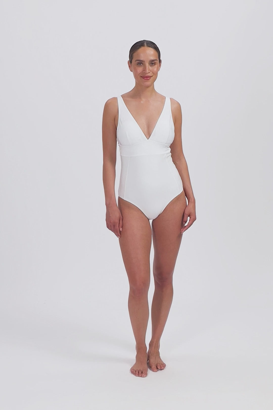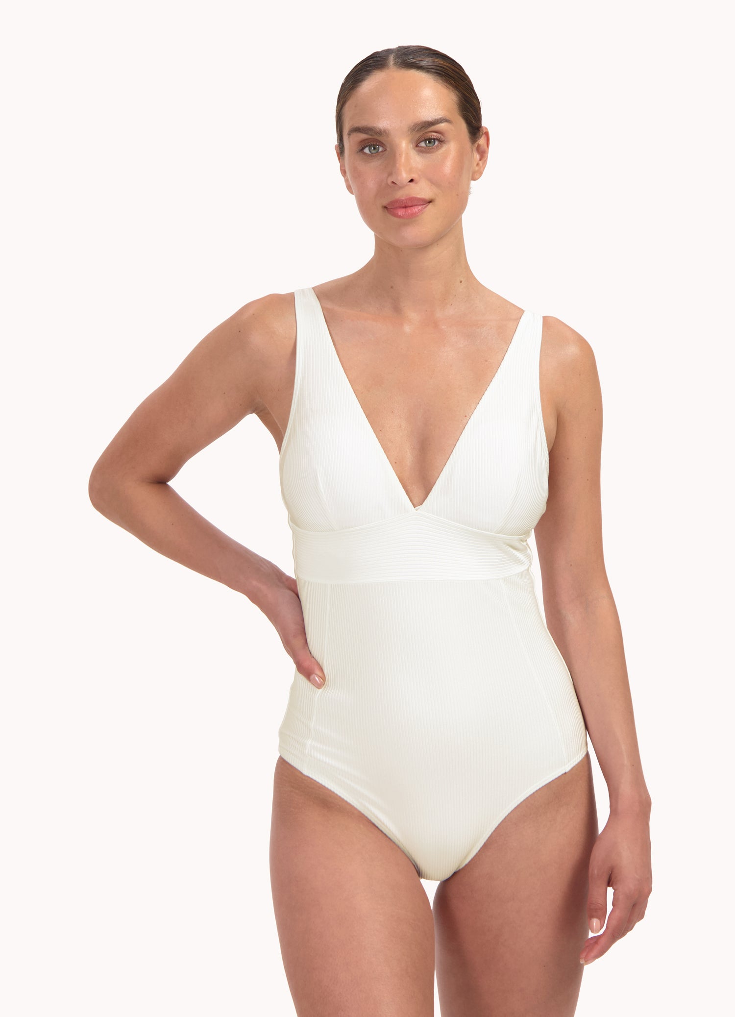 Dit model is 1.78 m en draagt maat 38B. De diepe V-hals zorgt voor een mooi decolleté. Het heeft een goede bedekking op de billen. Dit badpak wordt in cup B en D aangeboden. Draag je cupmaat A of C? Kies dan een cupmaat groter. Ga voor jouw reguliere confectiemaat.