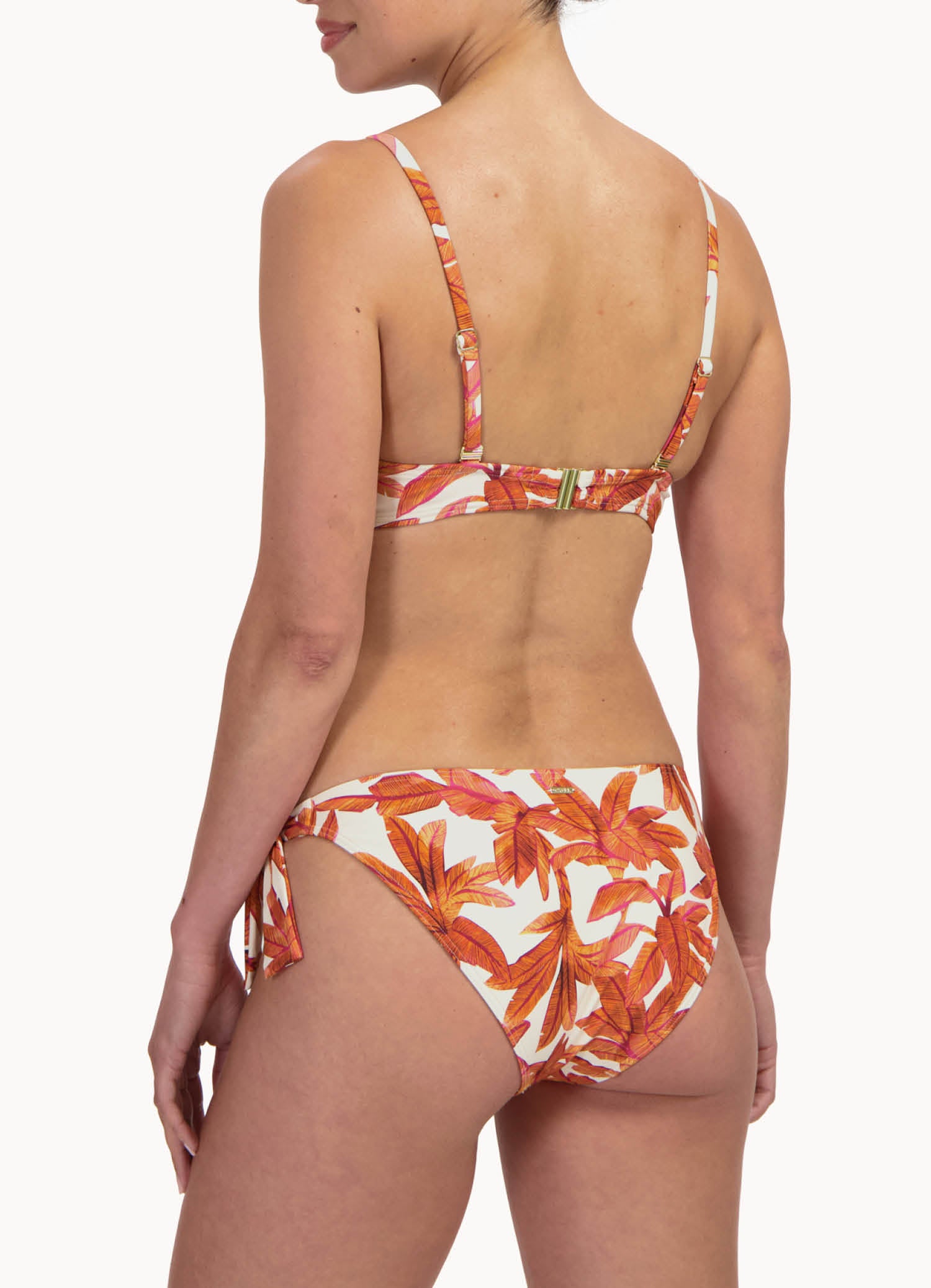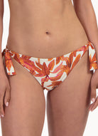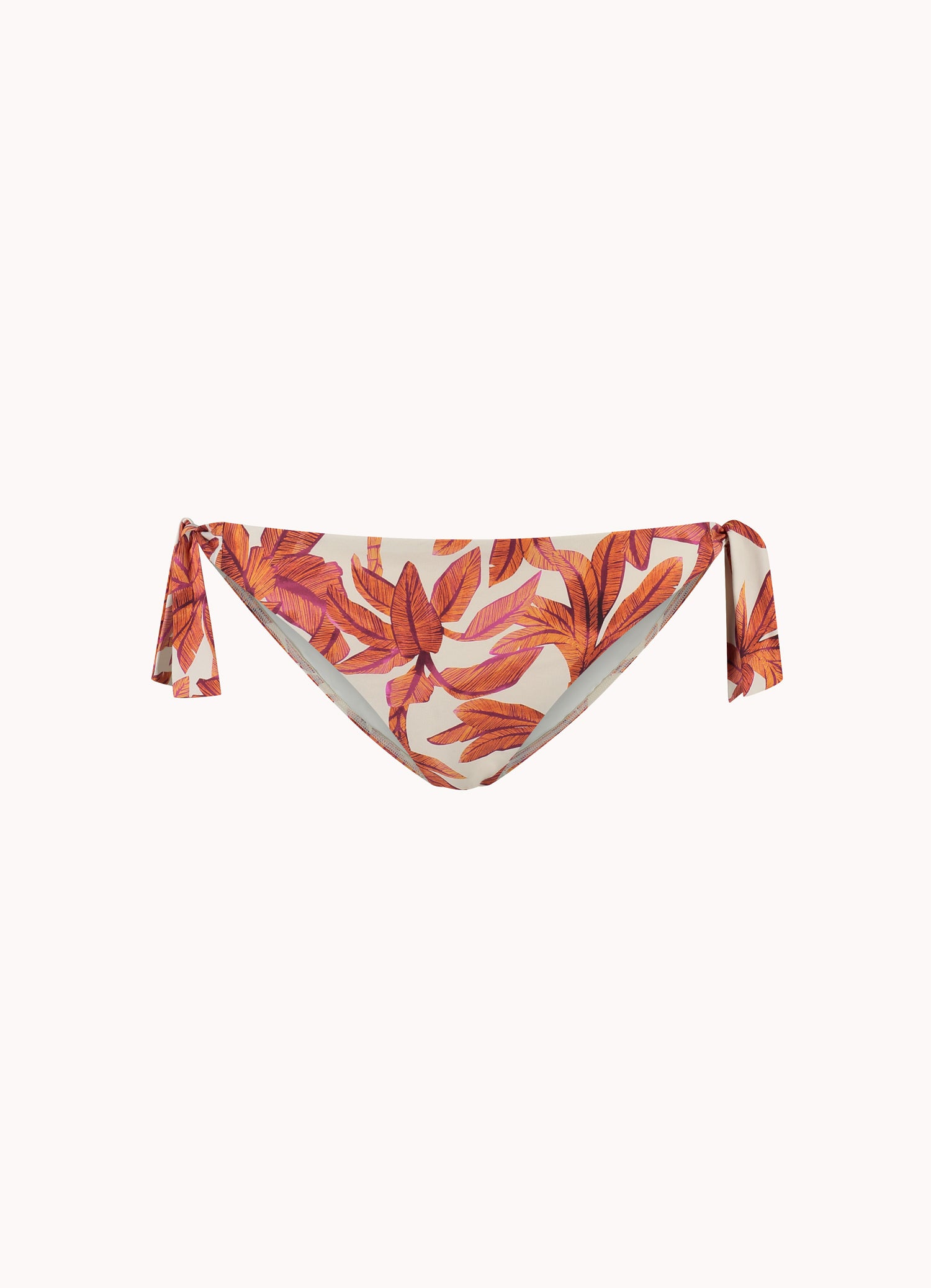 Dit model is 1,78m en draagt maat 38. Dit bikinibroekje met strikbandjes valt laag op jouw heupen en heeft een smalle bedekking op jouw billen.