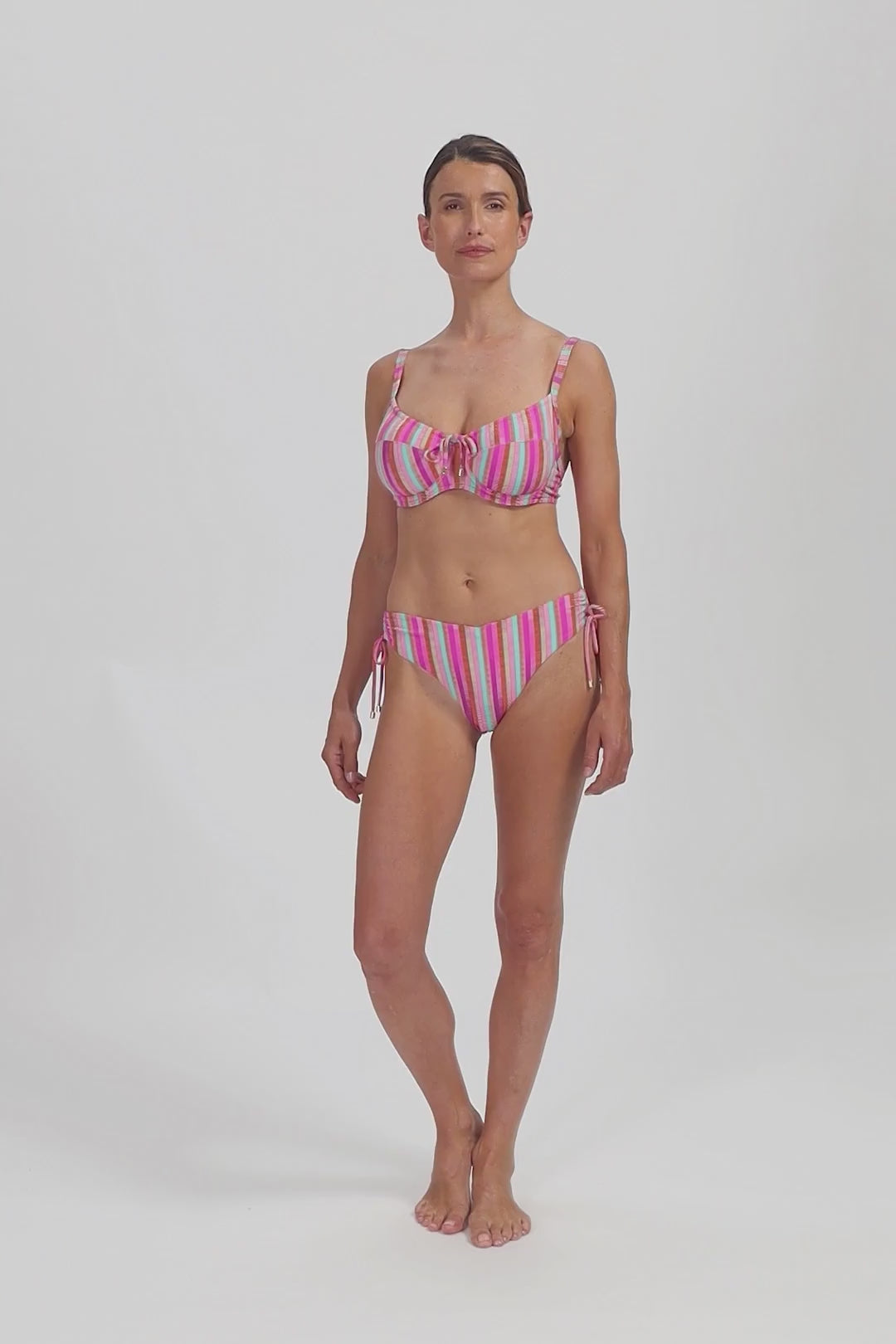 Model is 1,75 m en draagt maat 38E. Geschikt voor zowel kleine als grote borsten. Deze bikinitop biedt een goede ondersteuning door de gevoerde cups en beugel. Het heeft een comfortabele pasvorm. Heb je een grotere omvangsmaat? Dan is deze bikinitop een favoriete keuze.