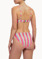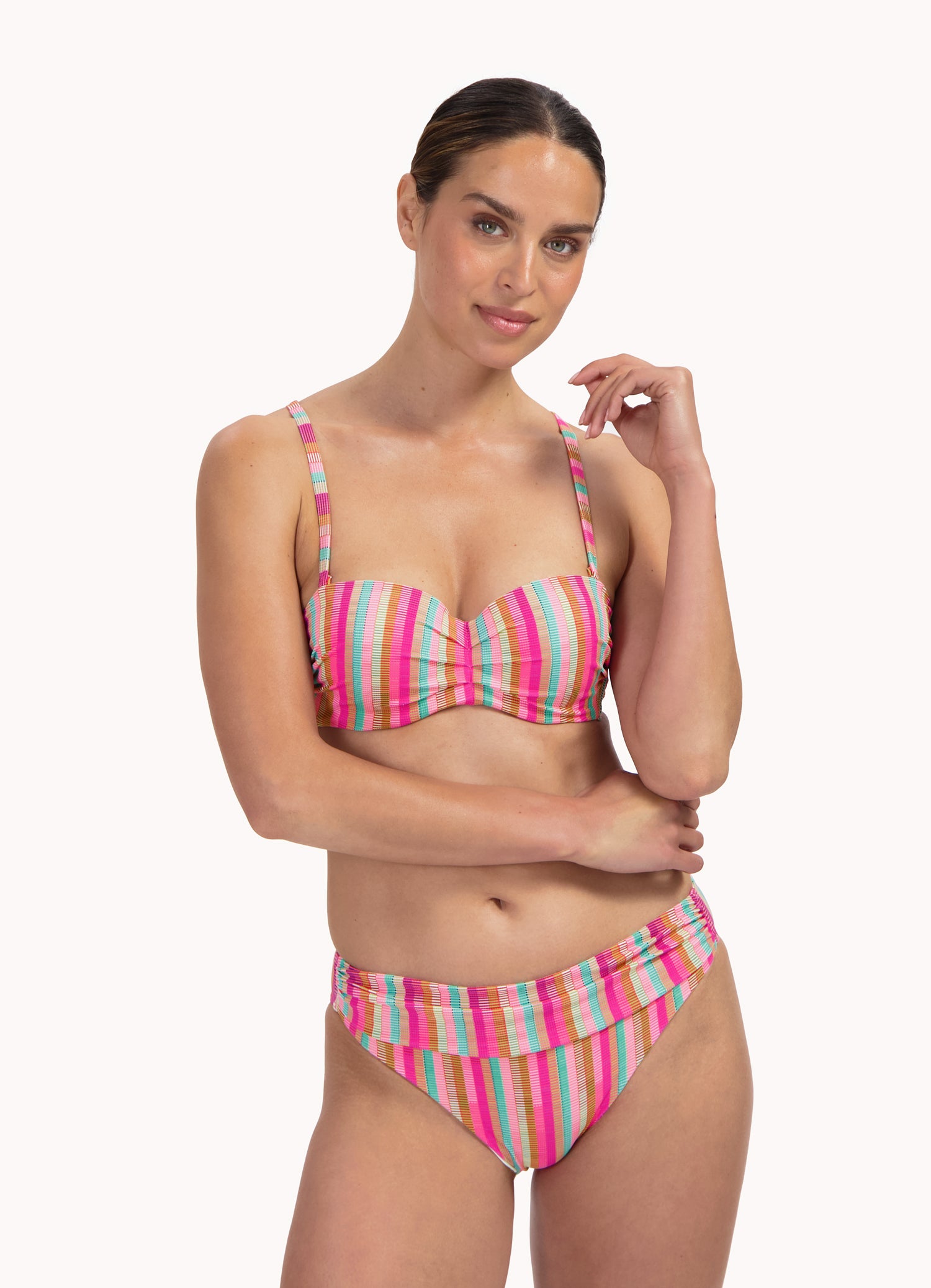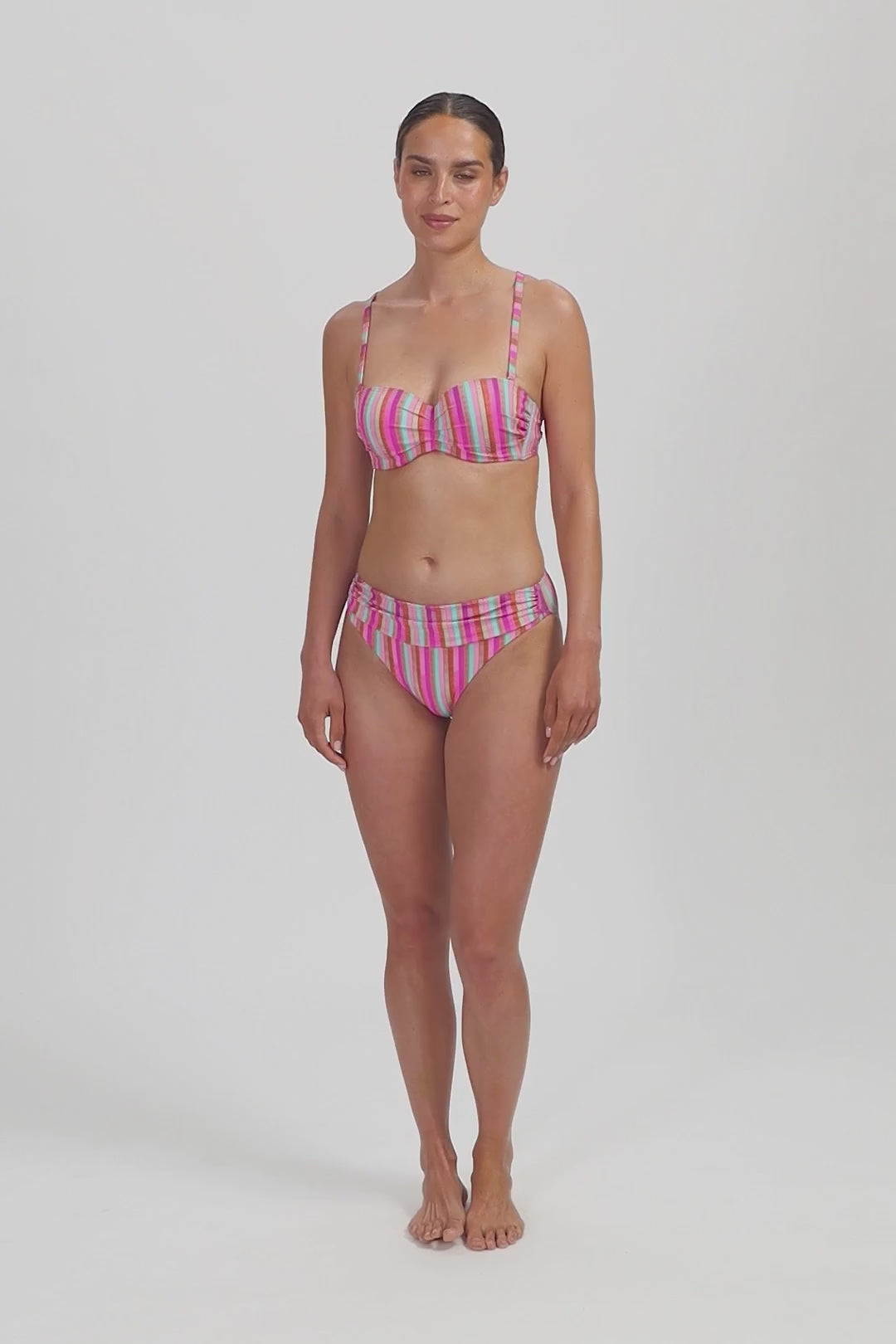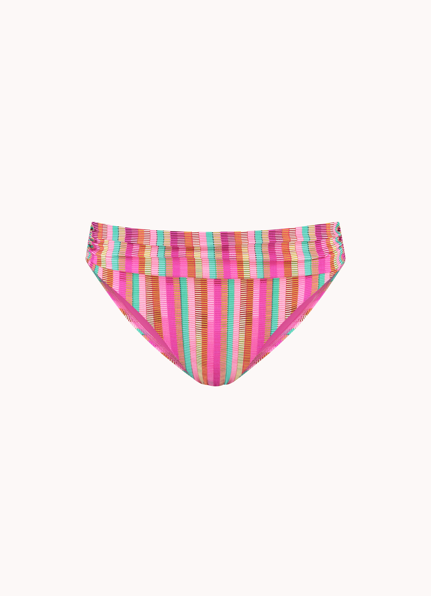 Dit model is 1,78m en draagt maat 38. Dit bikinibroekje valt net boven jouw heupen (middelhoge taille) en heeft een medium bedekking op jouw billen. Ideaal als je een klein buikje wil verdoezelen, door de flatterende plooitjes.